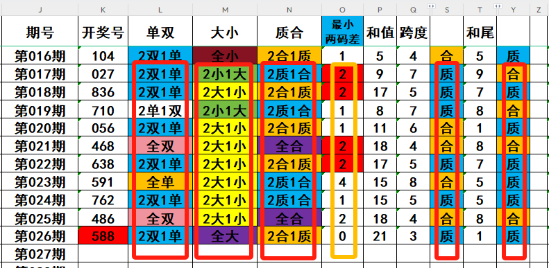 大家好,我是荒三帝丶。上期福彩3D第2025026期开奖588,形态组三,跨度3,和值21,和尾1,最小两码差0,两双一单,全大,开奖号为2路2路2路组合,奇数偶数偶数组合。质数合数合数组合,大号大号大号组合。下面有一张数据统计图,图中可以看到很多遗漏信息。关注遗漏值,也是我们选号的一个重要参考数据!这对于一些做追号计划的彩民具有很大的参考意义!接下来,我们先看数据图:再来分析福彩3D第2025027期。