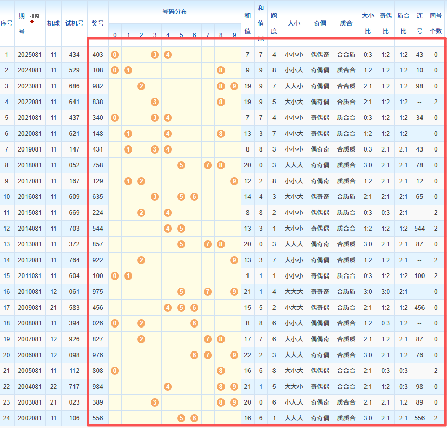 1、统计往年同期开奖号码