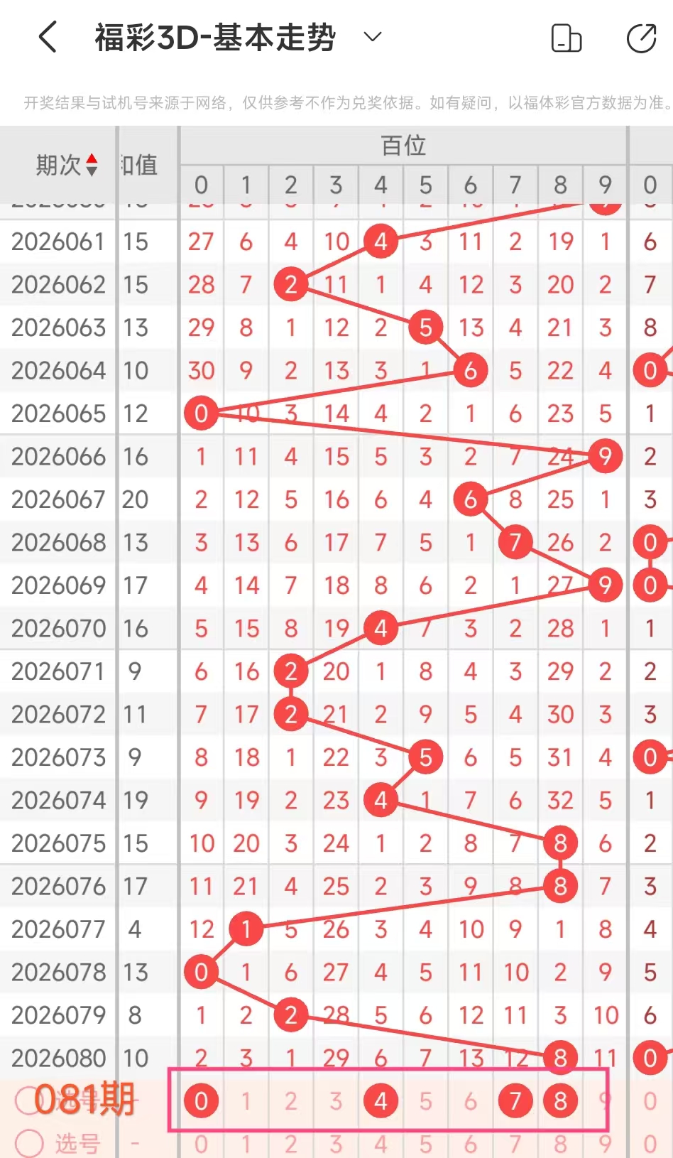 4、通过上述我们得到这期百十个位分析号码:百位1,十位578、个位0589