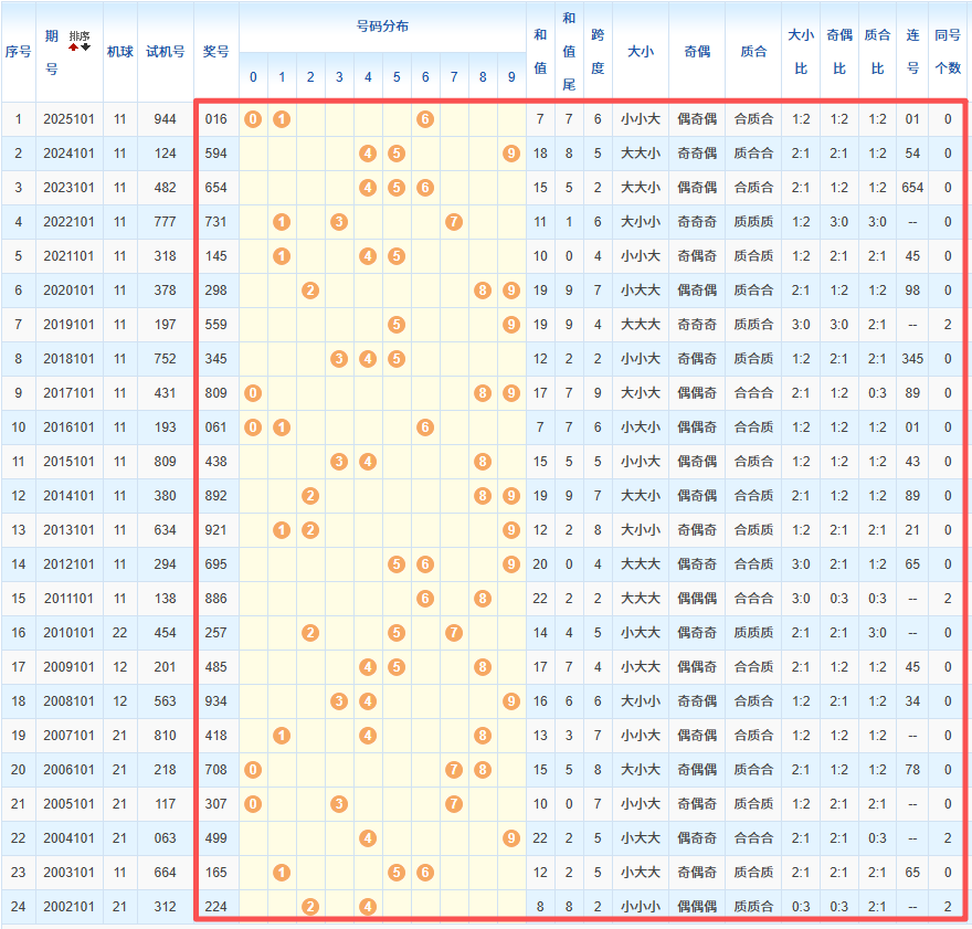 1、统计往年同期开奖号码