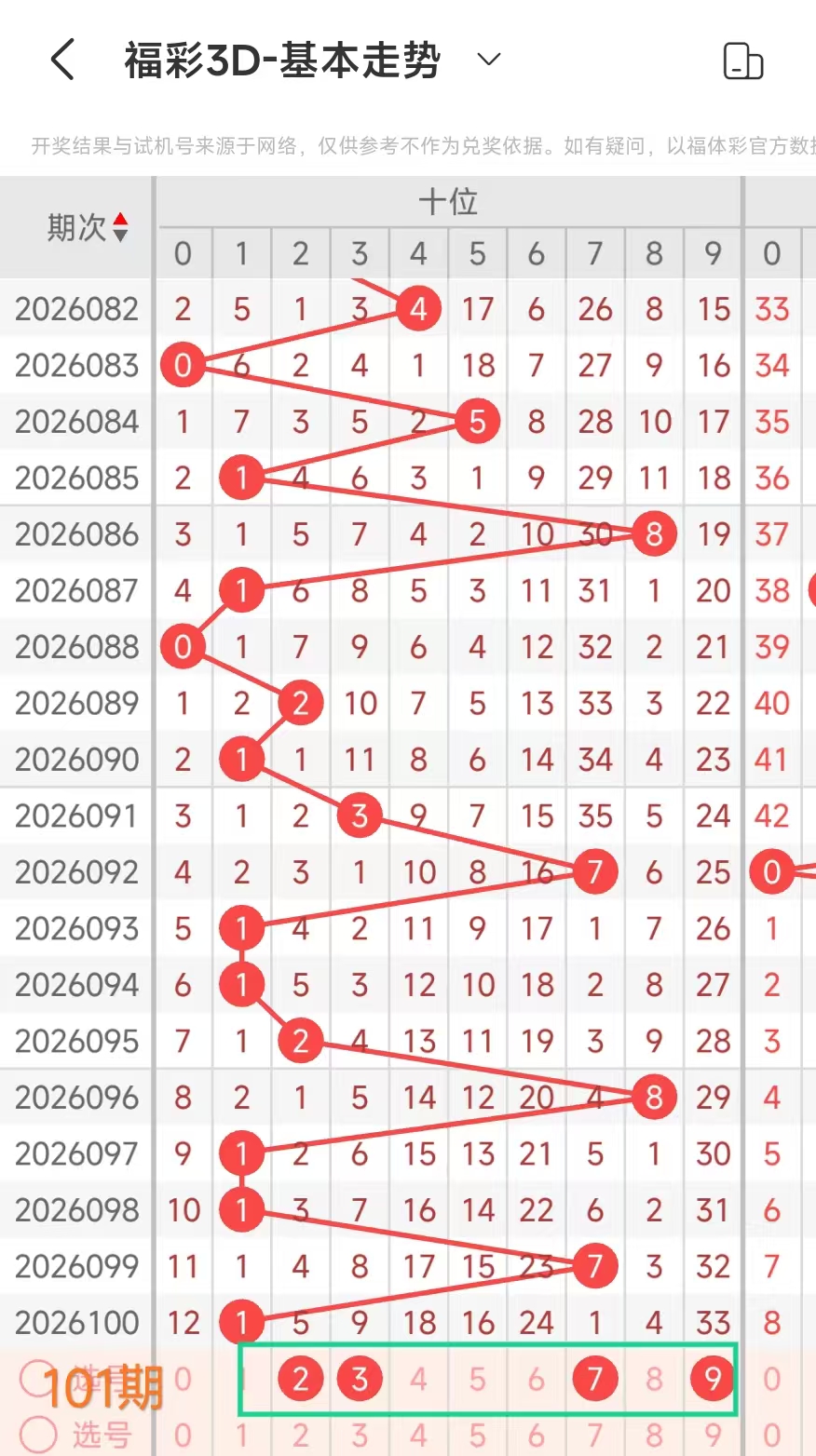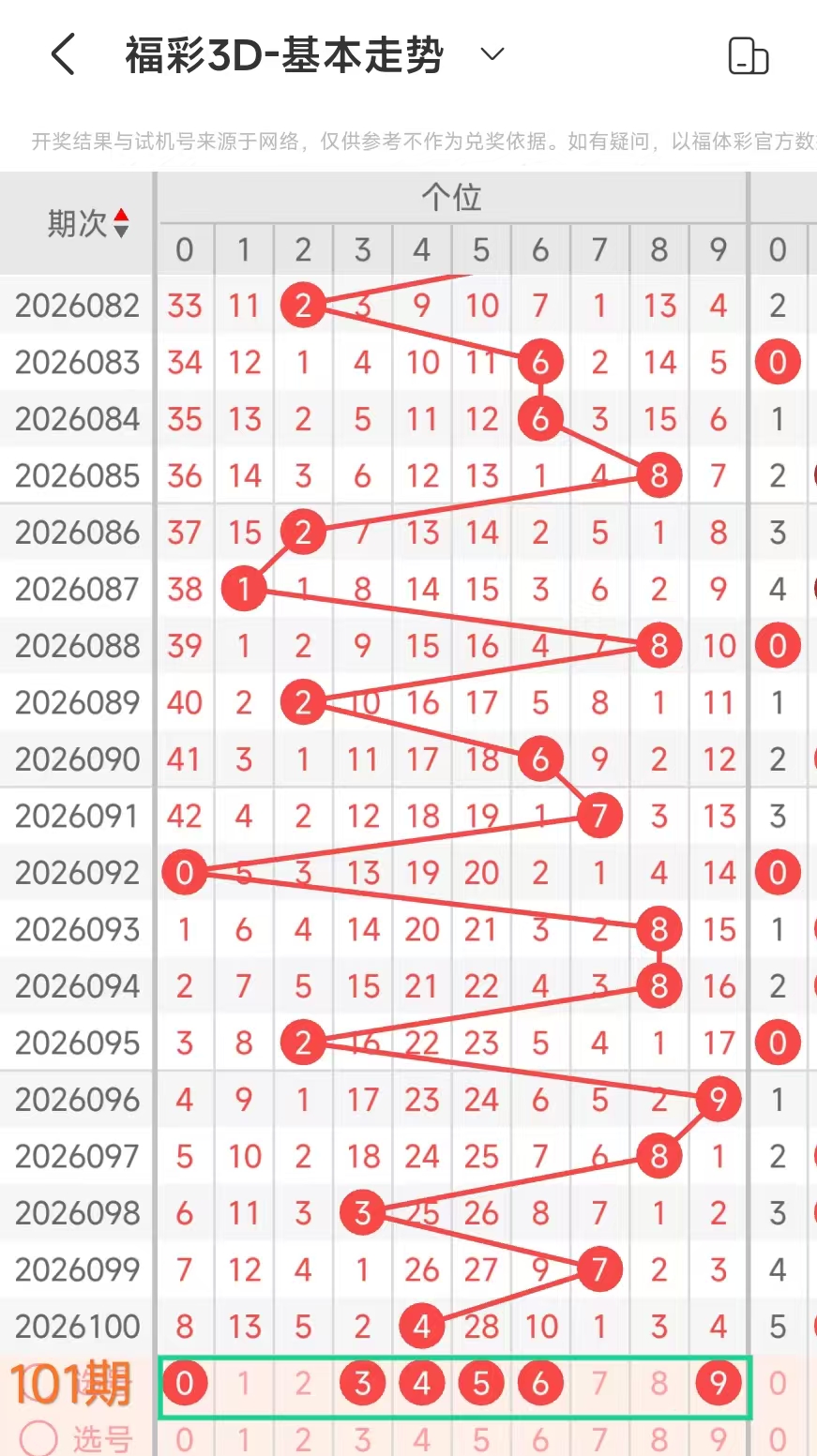我们选取上期开奖号码414、在一起彩APP上截取前100期的数据,分别记录当开出4、十1、个4、后下期开出什么号记录下来,然后一一分析。