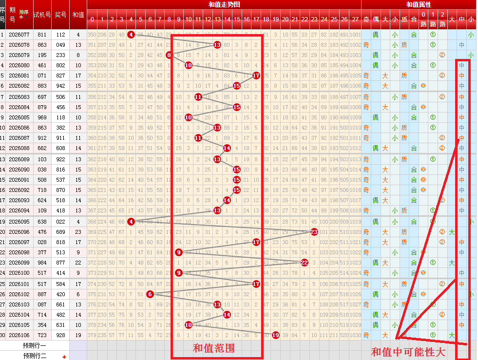 综上所述,本期和值区间9-17间,最佳和值区间11-14。
