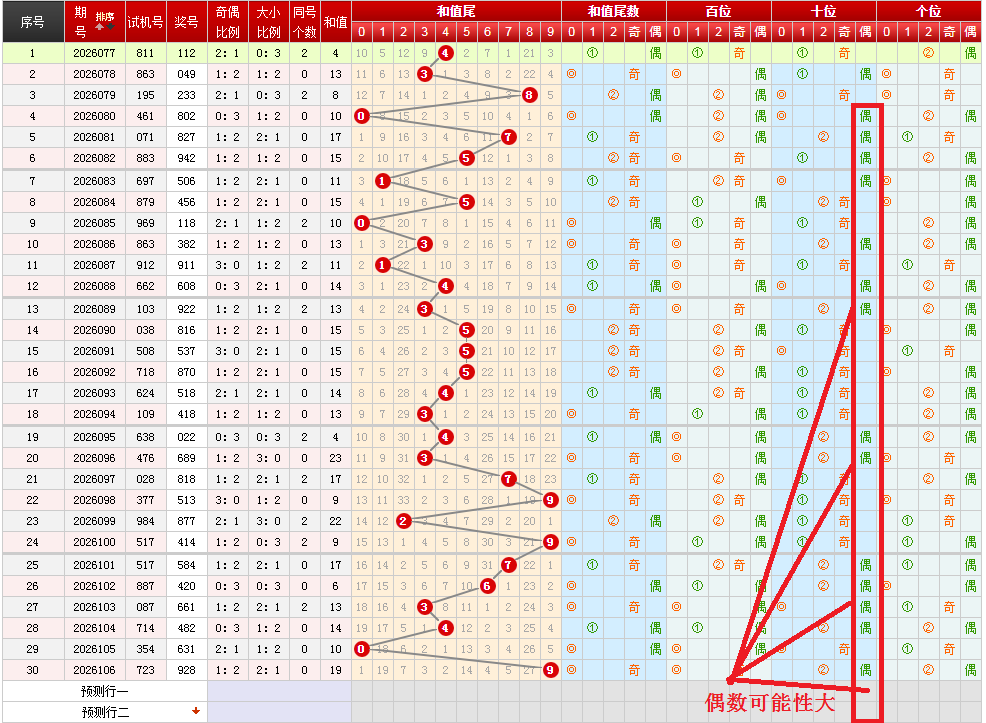 观察各位置奇偶开出趋势,本期选择奇数0-2个。