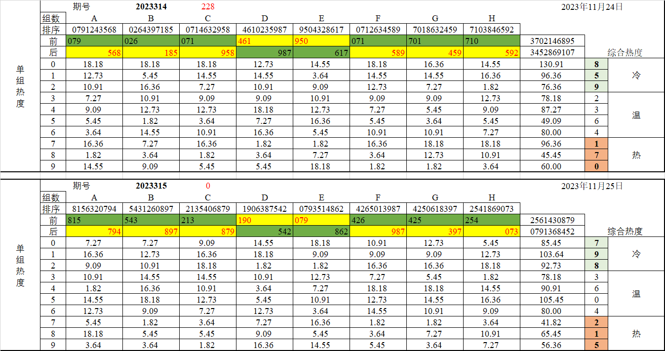 本期按照之前的方法,以黄色区域部分的三码数据进行统计排序,取出前三码,以绿色区域部分的三码数据进行统计排序,取出前三码;然后进行两两组合形成二码,本期依然关注。
