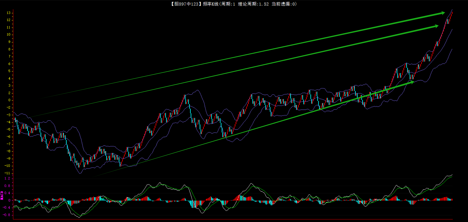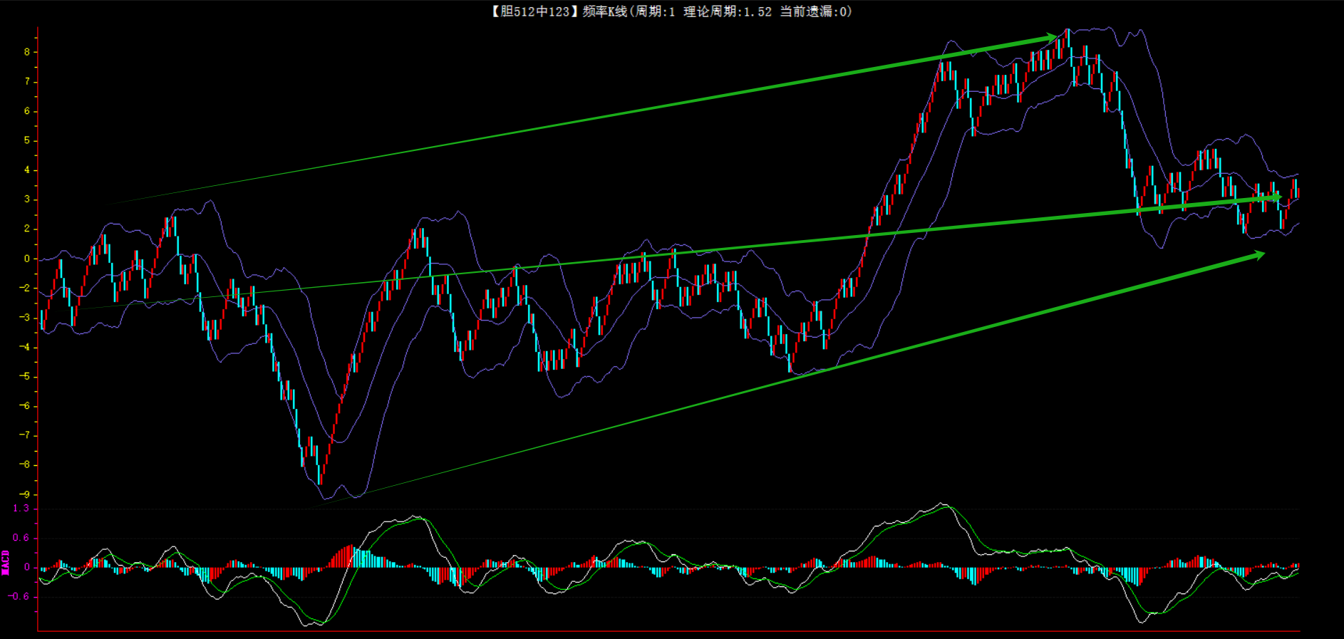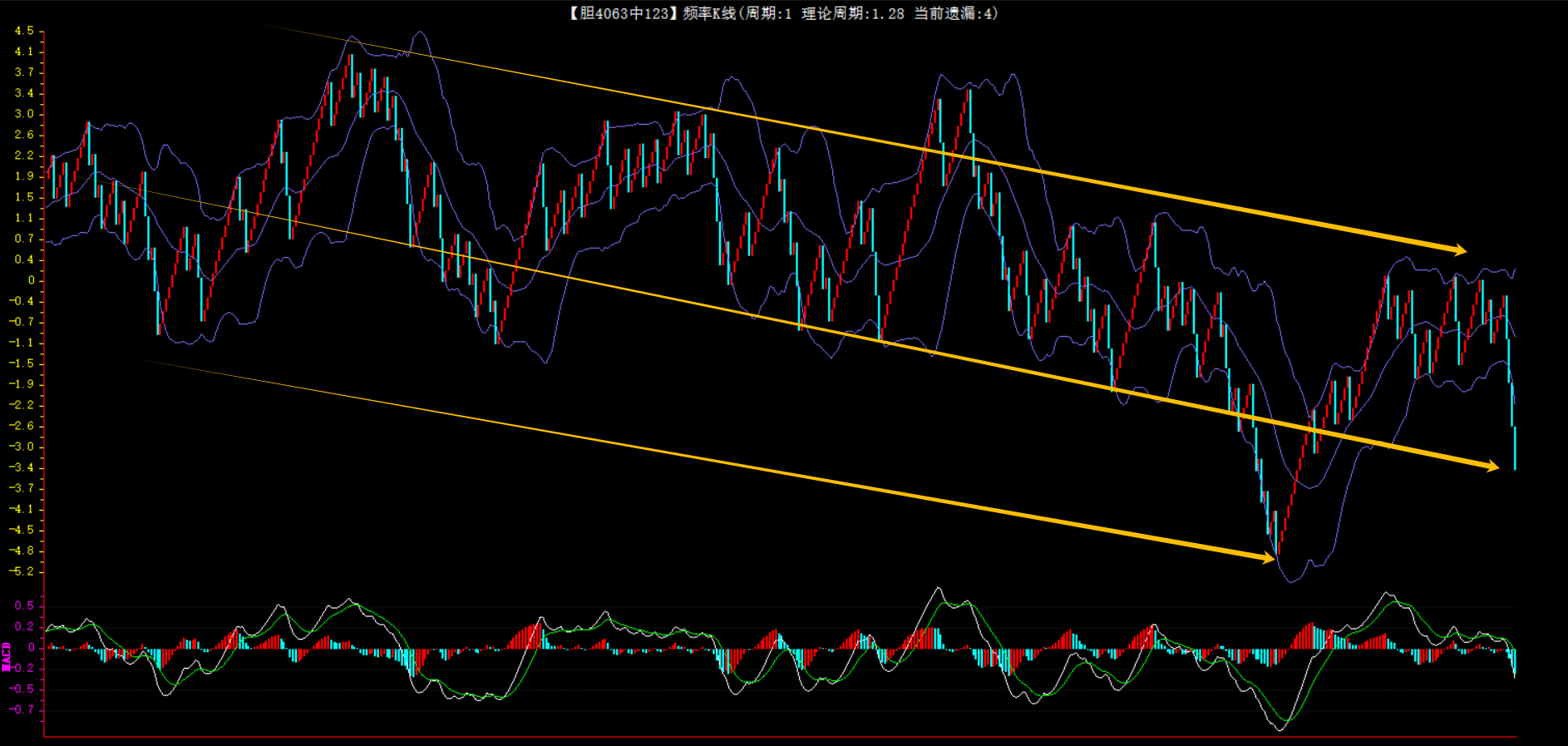 整体趋势下行,上边沿线趋势向下,下边沿趋势也是向下,节点震荡,当前遗漏4期,本期防守。