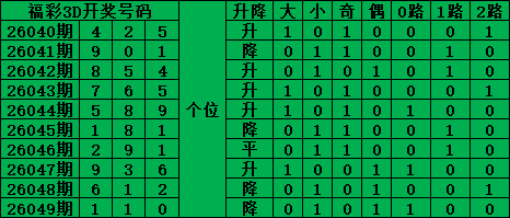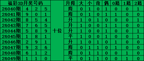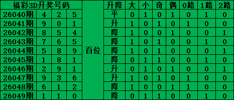 福彩3D是从0-9每期开出3个号码,截至2026049期三个位置最大遗漏的是42期的:百位的3号。
