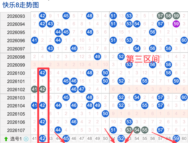 三区间开出了6个奖号(42.46.53.54.55.57)上期回顾三区开出6个奖号上期的三区间的奖号数量呈现一个递增的形态,4头回补1个,5头回补5个号,本期先来看号码42期出现频率相对来说还是很稳定。时间隔期数也是很稳定,是在近期的开奖中较热注意防守,号码45在近 30 期内出现次数相对是稳定的号码,近期的活跃度也是较热。号码52有一定的间歇性,通常间隔5-10期会出现一次,没有明显的连续出现态势,走势相对还是不很稳定,在整个第三区间的表现较温热本期还是可以防守的。号码59走势相对近期稳定,近期没有连续间隔落号的情况,活跃度近期处于稳定状态注意防守。