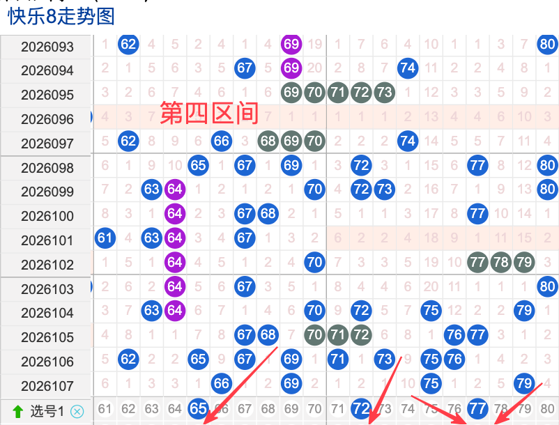 上期四区间开出了4个奖号(66.69.75.79)上期的四区开4个奖号呈现了一个递减趋势,开出的奖号6头回补2码,7头回补2个,先来看号码65在近 30 期内属于不是稳定的号码,近期出现频率相对温热,偶尔会间隔多期后出现一次,这个号码要注意防守,号码72具有一定的间歇性近期活跃度是很稳定比如有时会间隔3到8期就再次出现,有时会间隔多期,近期整体出现频率比较温热,近期还是要关注的.号码77活跃度近期比较热,有一定的间歇性,整体走势有一定的波动性.
