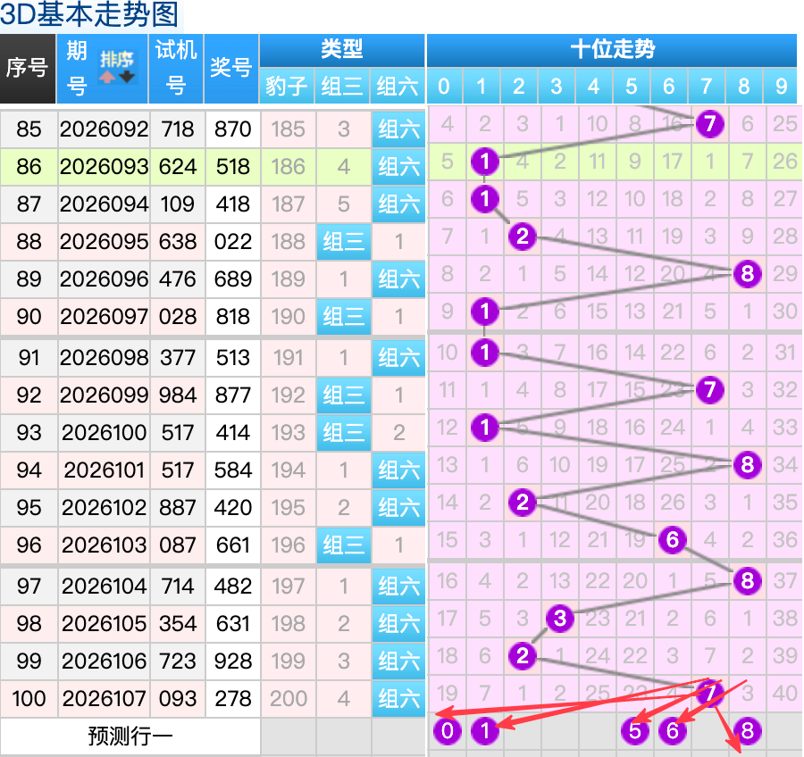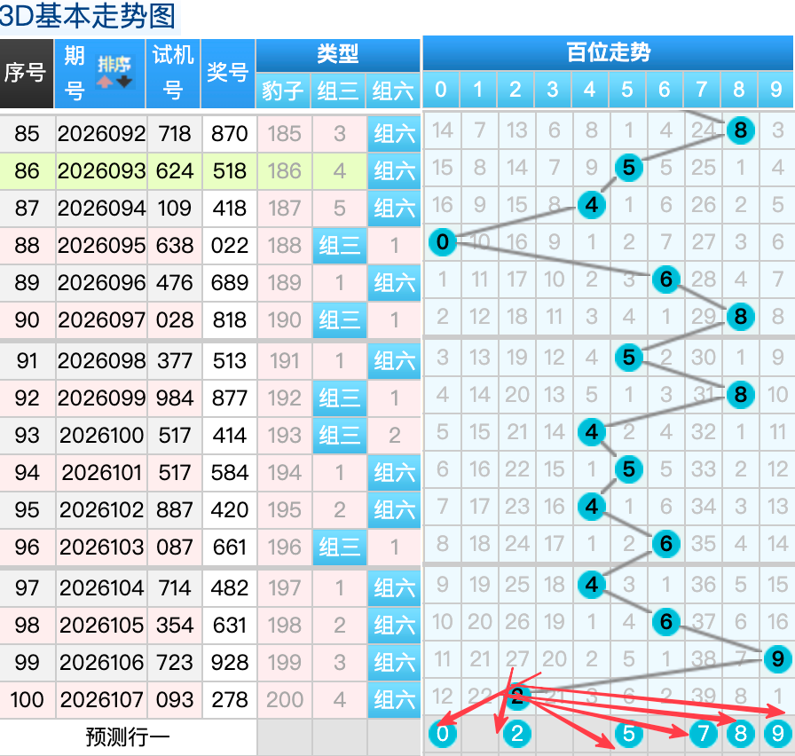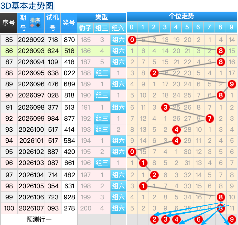 3D上期百位开出2号球,这个奖号2是一个冷码的回补落位趋势也是一个比较好的符合百位上的落位点,先看8号球这里还是有机会继续走出一个热号码的落位趋势还是要注意防守的,还有一个就是0号球这里的是2跨落位形态在这里的机会还是很好的要注意防守,然后9号球这里要注意是一个折返落位回补趋势注意防守,2号球在百位上要注意可能有机会走出重码落位的回补概率 。