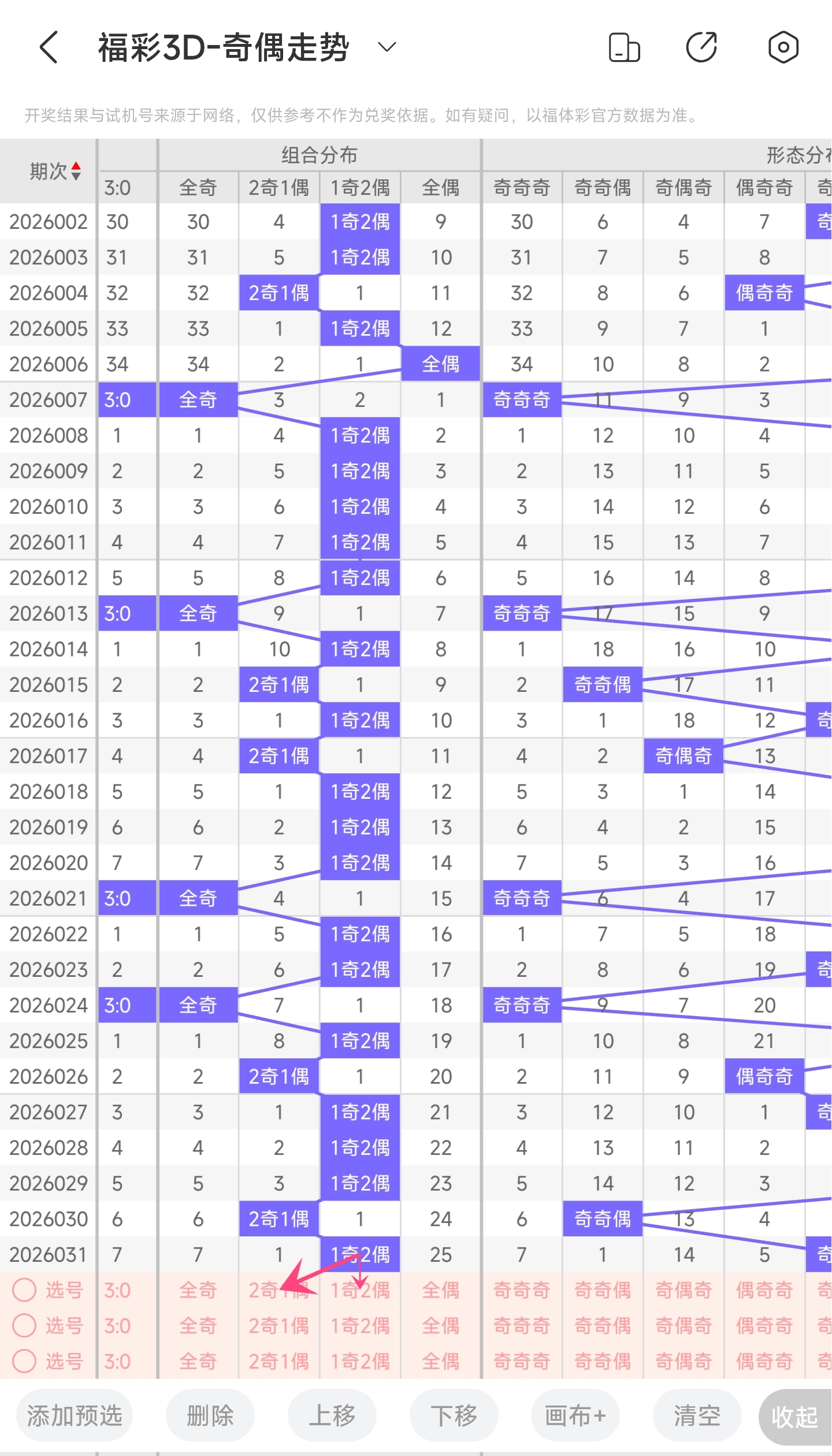 上期开了1奇2偶的情况,往前一期开出的是2奇1偶。从组合数学理论上来讲,开出2奇1偶和1奇2偶的概率都为37.5%,开出全偶和全奇的概率为12.5%。通过分析目前30期内的数据。本期的开出全偶的概率是3.33%,开出全奇的概率为13.33%,开出1奇2偶的概率为66.66%,开出2奇1偶的概率是16.66%。和前一期相比,概率没有变化。通过走势图分析,本期看好2奇1偶。所以本期推测可能开2奇1偶,其次是1奇2偶,然后是全奇或者全偶类型。