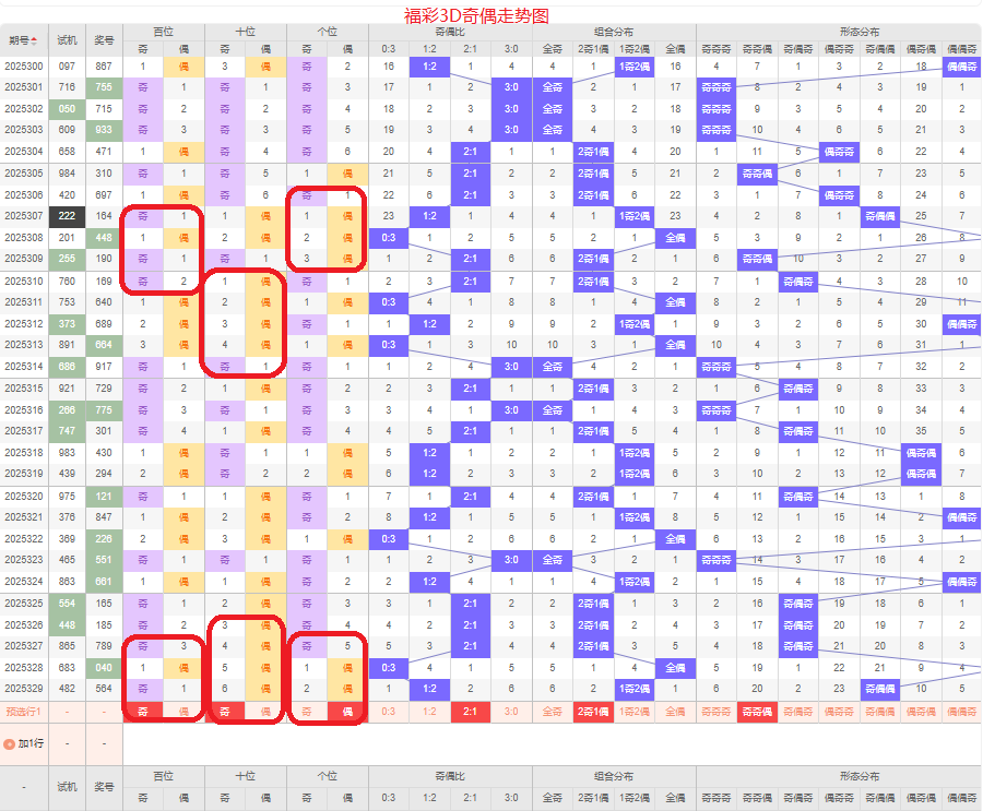 上期奇偶比是1:2,两偶的号码组合方式,从近五期的奇偶数出现情况看,奇数出现7次,偶数出现8次,奇数偶数号码出现较平均,本期侧重两奇的号码组合,侧重奇奇偶或偶奇奇的号码组合方式,根据奇偶形态做五码定位13579/13579/02468或02468/13579/13579