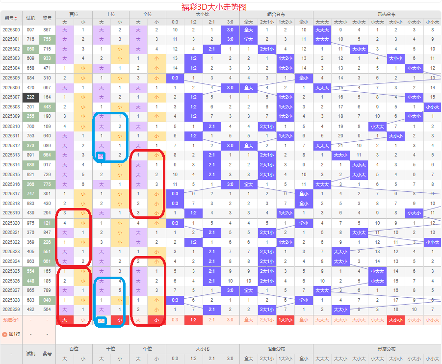 上期大小比为2:1,两大的号码组合方式,从近五期出现情况看,大号码出现9次,小号码出现6次,大号码出现较多,本期侧重两小的号码组合,本期百位侧重大号码,十位侧重小号码,个位要侧重看小,侧重大小小或者大小大的号码组合,根据大小做五码定位56789/01234/01234或56789/01234/56789