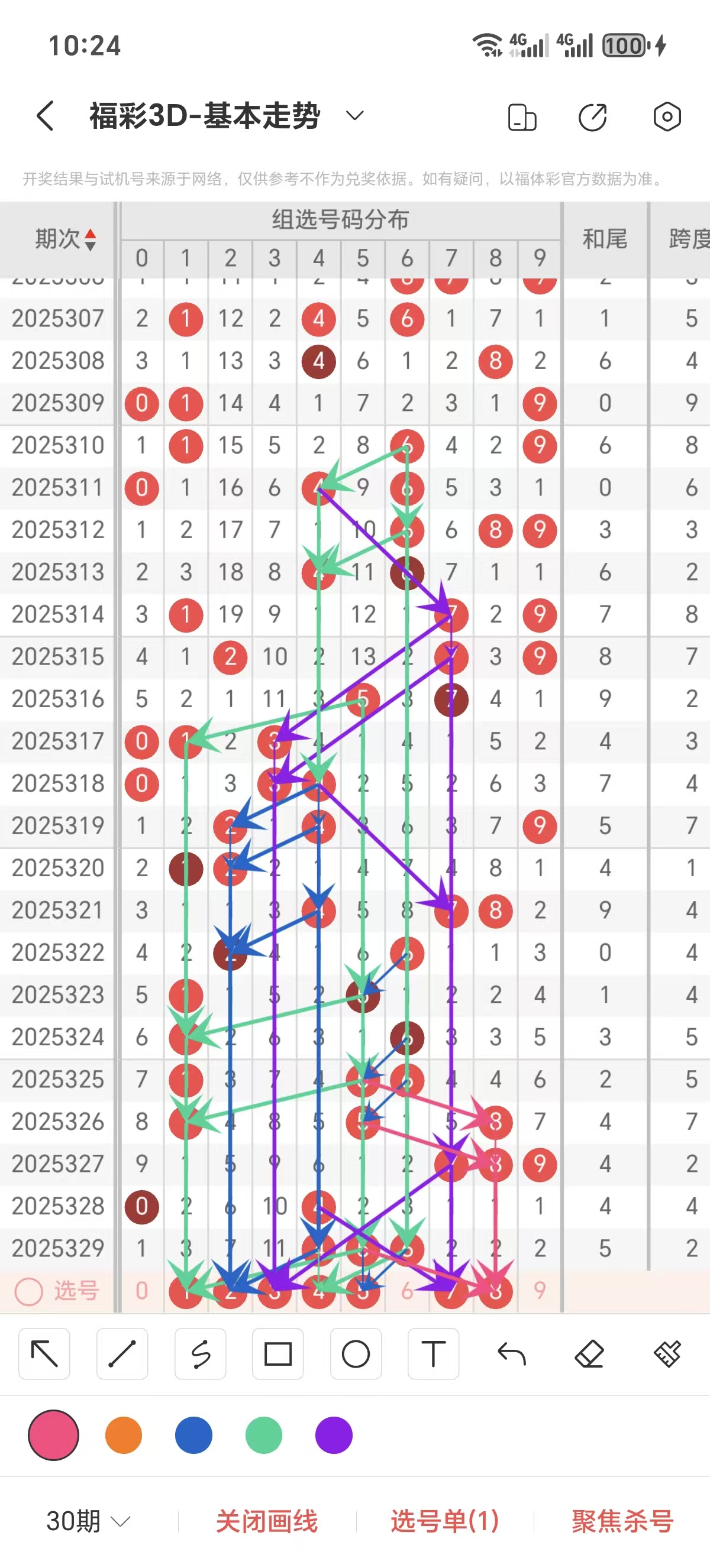 跨度通常情况下在五期之内重复一个跨度的概率很高,近五期重复了2的跨度,近五期跨度为5/7/2/4/2,近期12路的跨度较热,上期是2路的跨度,本期要侧重跨度以4/5/6跨为主的号码组合。可以从跨度方面选择相应的双胆码组合,双胆码的选取要根据近期和历史的走势进一步的分析选取。