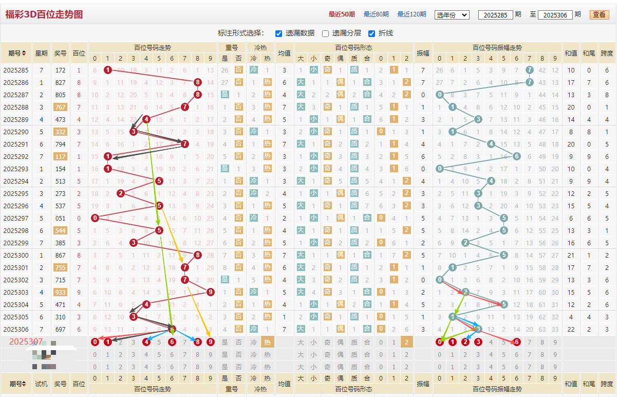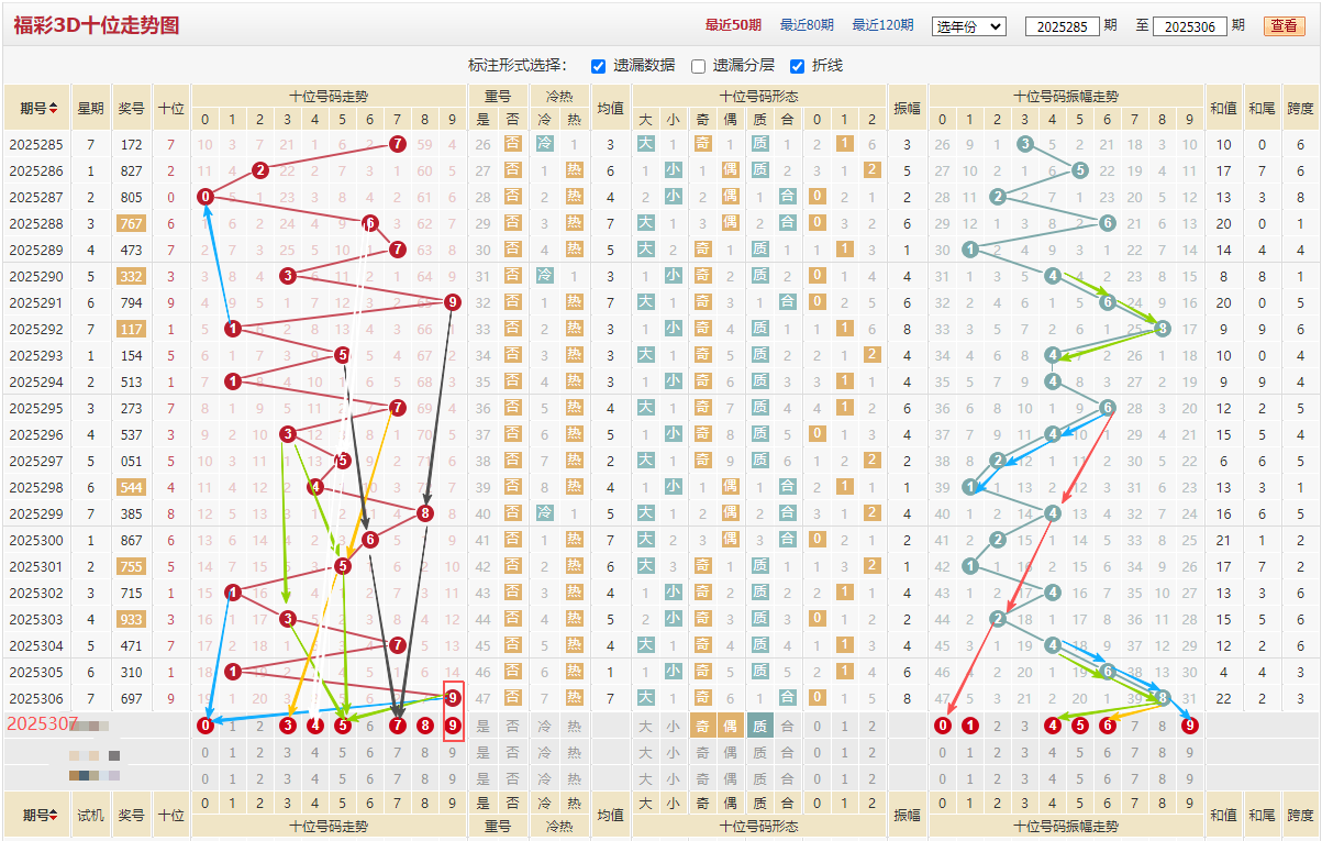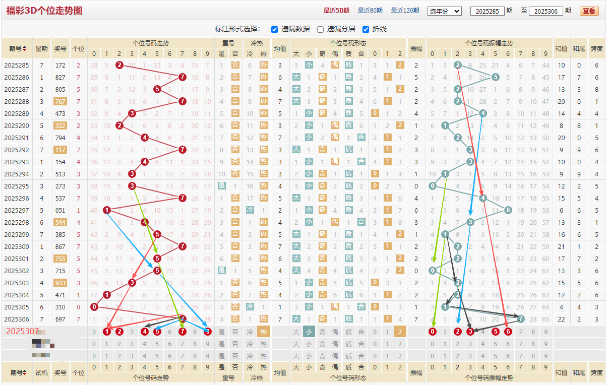 百位近期走势:1/5/2/5/0/5/3/8/7/7/9/4/3/6,质数占优开出9期,本期个人则重点看合数,质数太热小防一手,见上图振幅红色线025/136同样走势对应数字0,绿色线2/1/0对应数字6,看左边绿色线4/5/6等隔,重点在黑色线4371一样的走势,综合上述百位推荐:014689