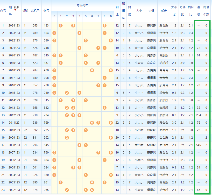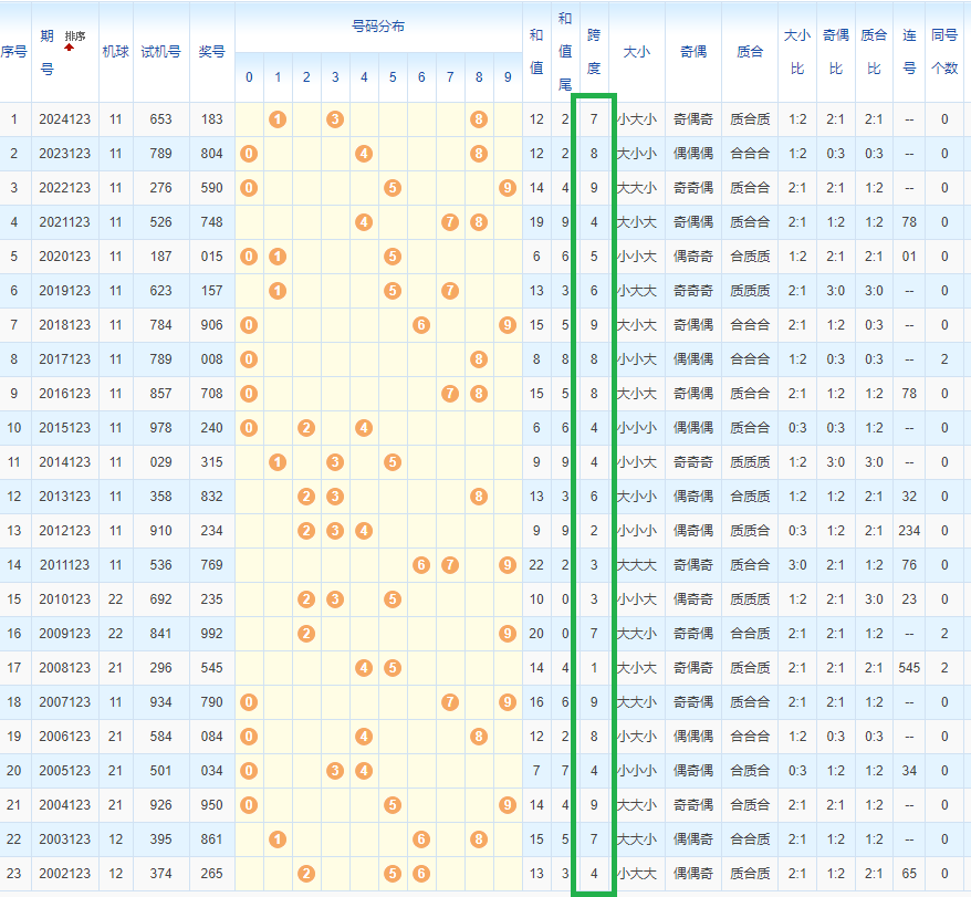 这23期跨度4789出现概率大,这期可以考虑4789跨度。