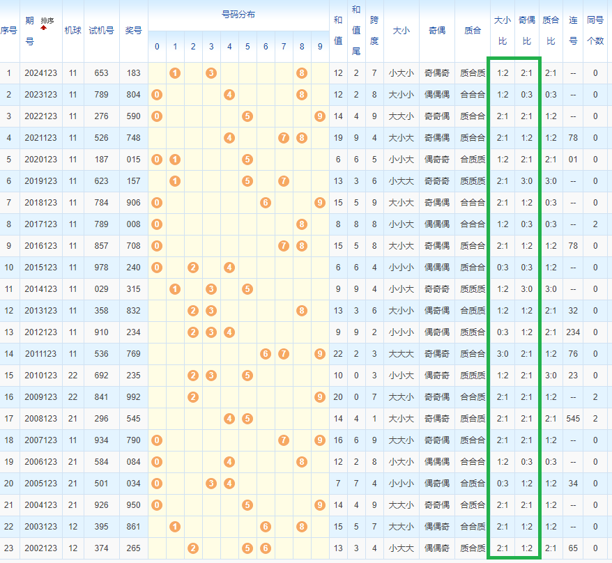 这23期大小比2:1出靠前,这期优先选2:1。奇偶:1:2出靠前,奇偶比优先1:2