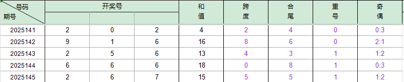 2025141期开奖号码202,我们可以看出近30期百位2出现4次,十位0出现4次(较145期减一),个位2出现2次。