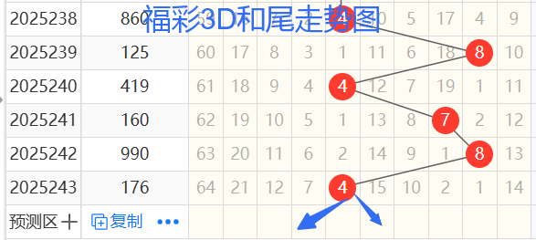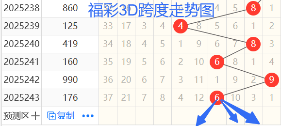 2)我们来看跨度;还是以239期——243期为例,如图依次是48696跨度,按照路数转换关系来看,那么跨度我们暂定258147跨,本期个人比较看好5 7 8跨。