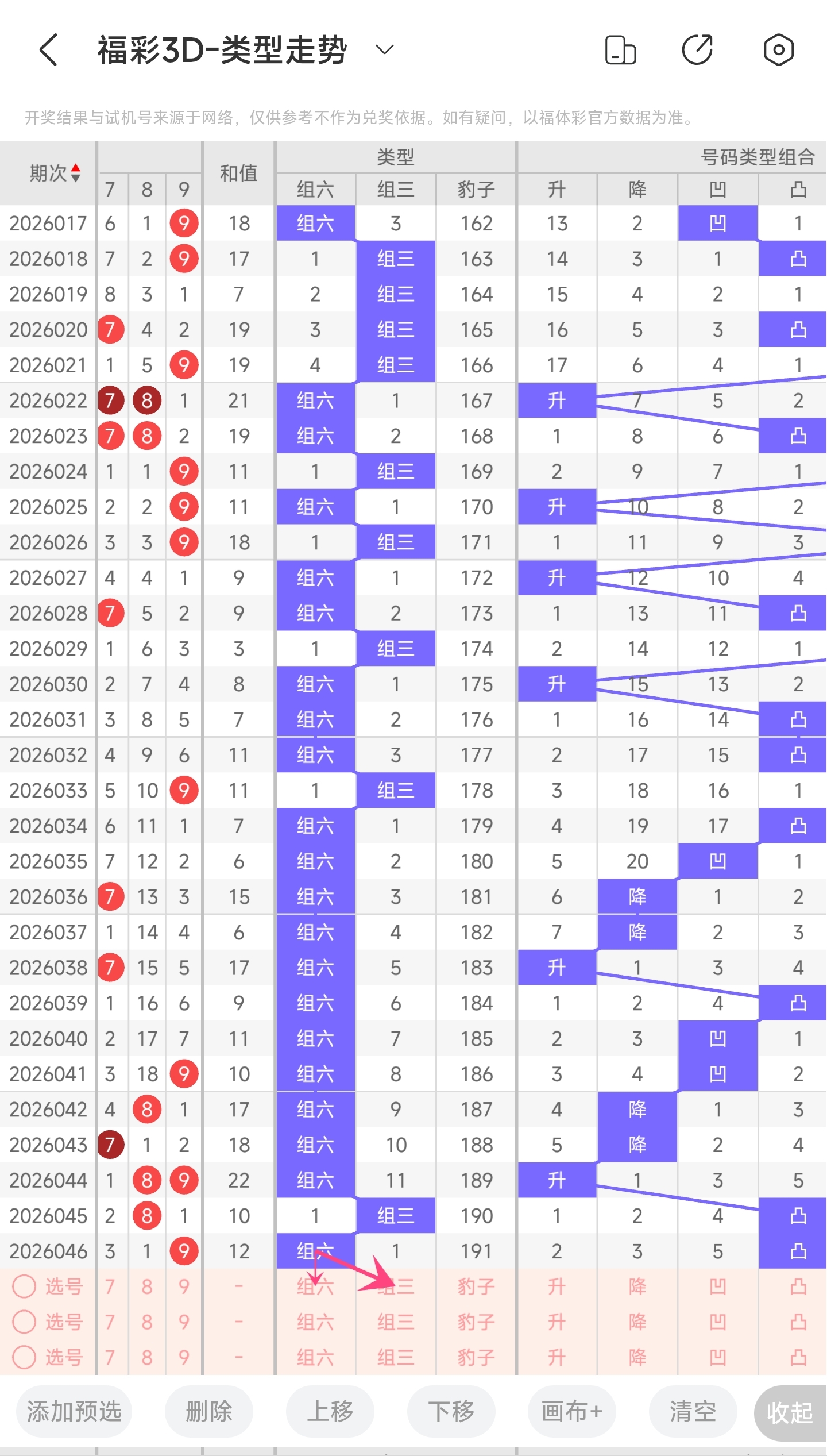 上期开出了组六类型,往前一期是组三类型。理论上开出组六的概率是72%,开出组三的概率是27%,开出豹子的概率是1%。通过分析目前30期内已经开出的概率,组六概率为70%,开出组三概率是30%。开出豹子的概率为0%。与前一期相比,概率没有变化。通过走势图可以看到上期开了组六,本期看好组六。所以推测本期大概率开组六,防开组三。