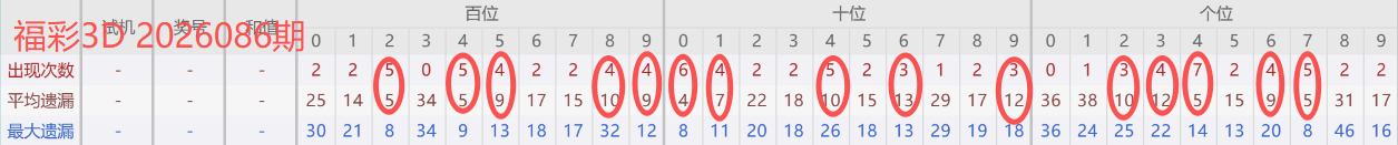 2026084期开奖号码456,我们可以看出近30期百位4出现5次,十位5出现2次,个位6出现4次。