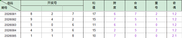开奖回顾:福彩3D 第2026085期开出中奖号码为118,组合形态为组三、和值为10、合尾0、跨度7、重号0、奇偶比为2:1、百位1近30期出现2期,十位1近30期出现4期,个位8近30期出现2期。