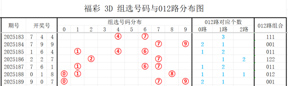 近7期(183~189)开奖号与012路组合分别为744(111)、799(001)、164(011)、227(122)、761(011)、018(012)、907(001),上期开奖号为001路组合,根据整体走势分析,本期看好的012路组合有:012、002、022、112,防000、011、001组合。