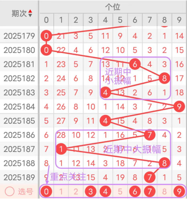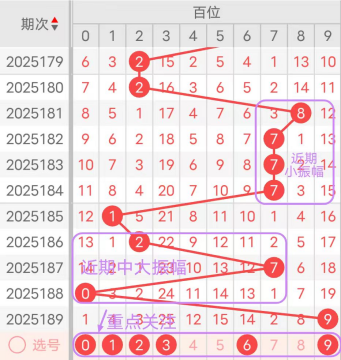 近7期(183~189)开奖号百位号码球分别为7、7、1、2、7、0、9,开奖号与上一期走出的振幅分别为0、0、6、1、5、7、9,183期走出7号大数号码球,走出“0”的小幅度,184期走出7号大数号码球,走出“0”的小幅度,185期走出1号小数号码球,走出“6”的中大幅度,186期走出2号小数号码球,走出“1”的小幅度,187期走出7号大数号码球,走出“5”的中大幅度,188期走出0号小数号码球,走出“7”的大幅度,189期走出9号大数号码球,走出“9”的大幅度;从振幅大小及走势图的整体形势,中大幅度走在6~9之间较为适宜,中小幅度走在0~3之间较为适宜;结合走势图的整体及大小走势分析,本期百位需重点关注号码球为0、1、2、3、6、9。