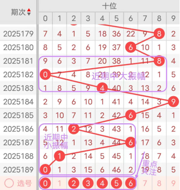 近7期(183~189)开奖号十位号码球分别为4、9、6、2、6、1、0,开奖号与上一期走出的振幅分别为4、5、3、4、4、5、1,183期走出4号中小数号码球,走出“4”的中小幅度,184期走出9号大数号码球,走出“5”的中大幅度,185期走出6号中大数号码球,走出“3”的中小幅度,186期走出2号小数号码球,走出“4”的中小幅度,187期走出6号中大数号码球,走出“4”的中小幅度,188期走出1号小数号码球,走出“5”的中大幅度,189期走出0号小数号码球,走出“1”的小幅度;从振幅大小及走势图的整体对应来看,中大振幅走在4~6之间较为适宜,中小振幅走在0~3之间较为适宜;结合走势图的上下对应及振幅大小分析,本期十位应重点关注号码球为0、2、3、4、5、6。