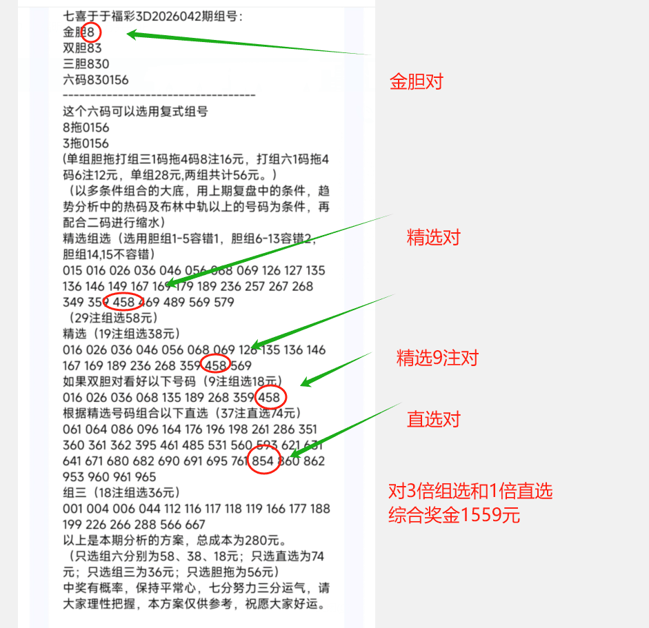 上期“会员专区”文章分析,金胆对、精选9注对、直选对,对3倍组选和1倍直选,综合奖金1559元。