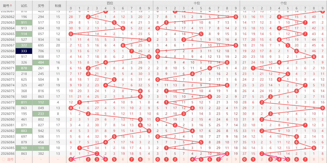 百位上期开出号码3,小数,奇数、百位近5期开出号码为:9-5-4-1-3,从近5期看82期遗漏为12,83期遗漏为9,84期遗漏为4,85期遗漏为7,86期遗漏为34,本期号码关注遗漏号码0、4,大小数走势为大大小小小,小号码走热,本期继续关注大数开出,奇偶走势为奇奇偶奇奇。奇数形态走热,注意奇数开出。本期百位推荐:0-2-3-4-5-7-8,