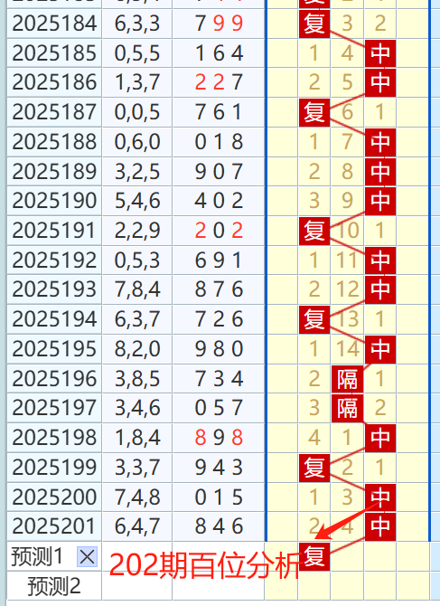 上期在最大值走势上预测了7,预测错误,本期根据中码走势分析,本期百位预计开出复码;