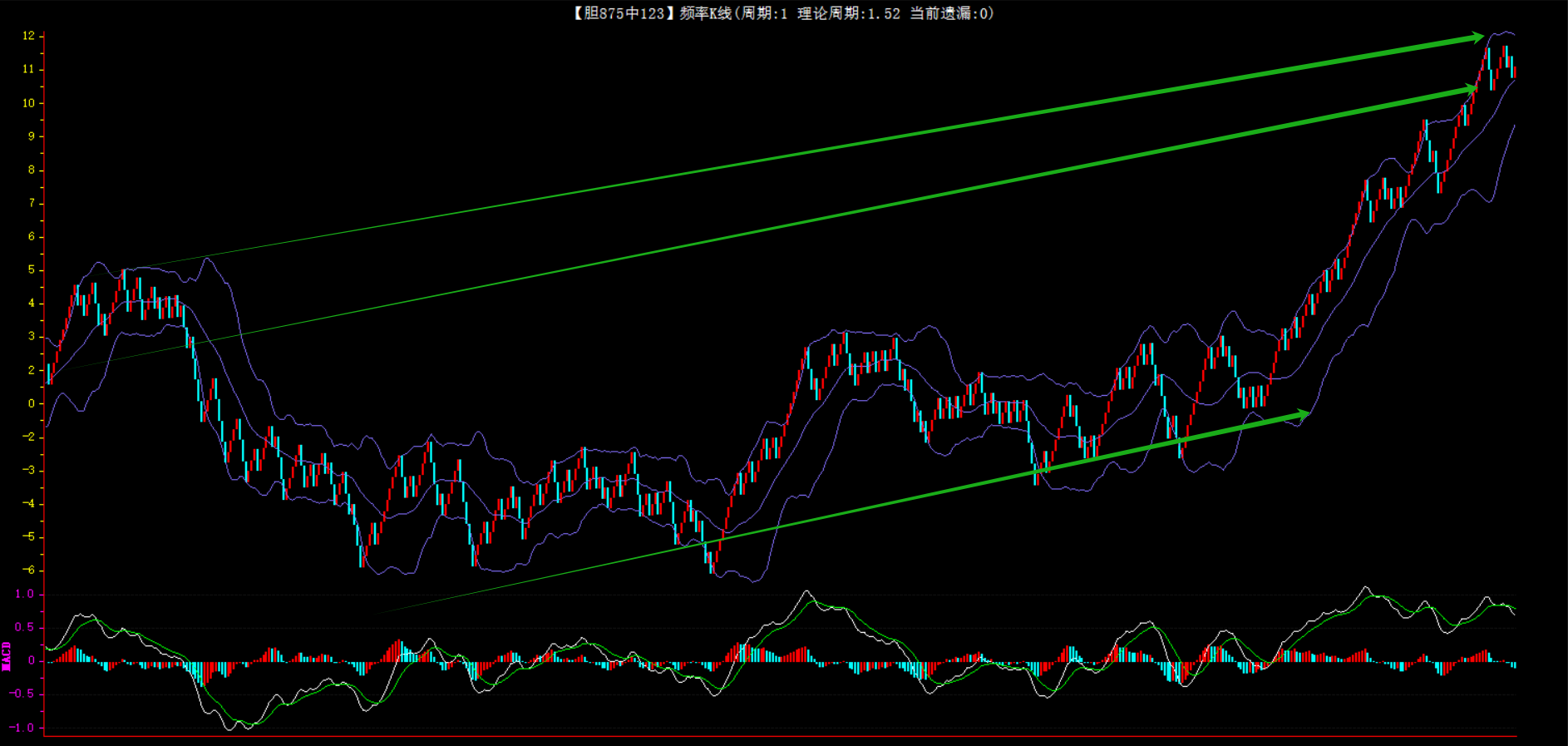 整体趋势上行,上边沿线趋势向上,下边沿趋势也是向上,节点震荡,当前开1期,本期关注。