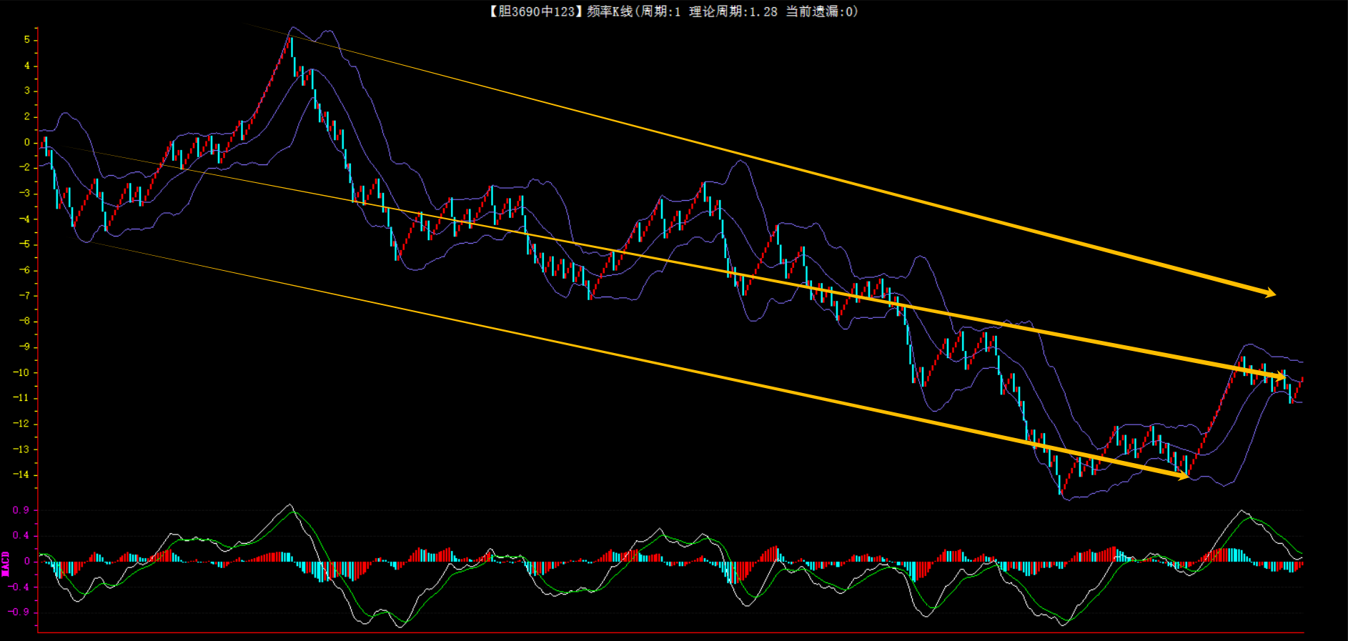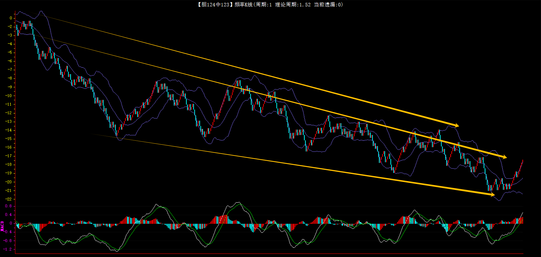 整体趋势下行,上边沿线趋势向下,下边沿趋势也是向下,节点震荡,当前连开6期,本期防守。