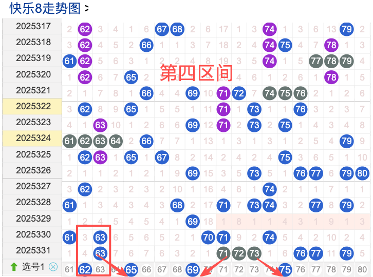 上期四区间开出了7奖号(63.71.72.73.76.77.79)上期的四区开7个奖号呈现了一个递的趋势,开出的奖号7头回补66头开也是回补了1个,先来看号码65在近 30 期内属于还是很稳定的号码,近期出现频率相对还是比较稳定的,偶尔会间隔多期后出现一次,这个号码要注意防守,号码69具有一定的间歇性活跃度较比如有时会间隔 3到4期就再次出现,也有时会间隔多期,近期整体出现频率比较,近期还是要关注的.号码75活跃度近期比较,有一定的间歇性。活跃度近期不算稳定,整体走势有一定的波动性.