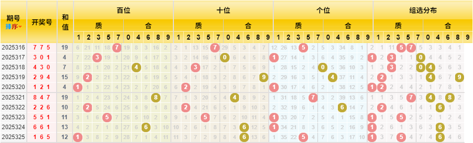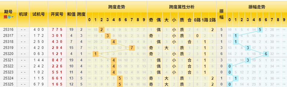 近10期跨度值(截至325期)为:2, 3, 4, 7, 1, 4, 4, 4, 5, 5。跨度5连续两期开出。从分布看,中小跨度(3-6)仍是主流。本期跨度可关注 1、4、5、6等,看好跨度在 4或6 附近开出。
