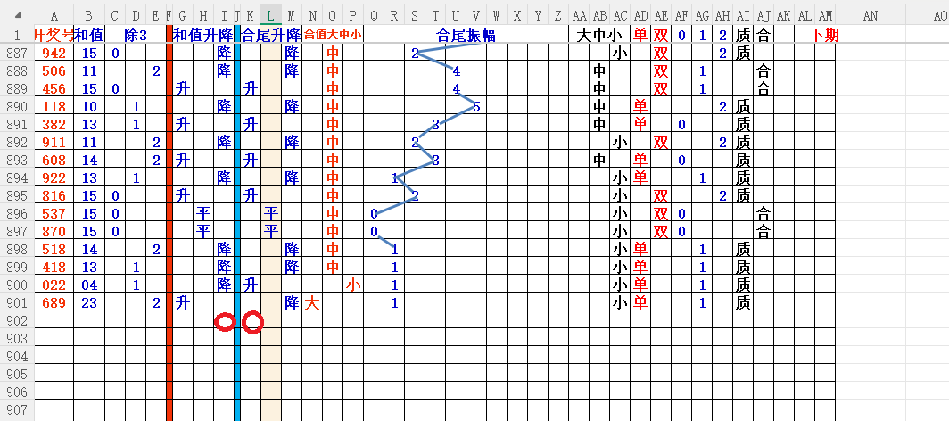 如上图3,和值升降平分析,和值升概率大,小于23和值