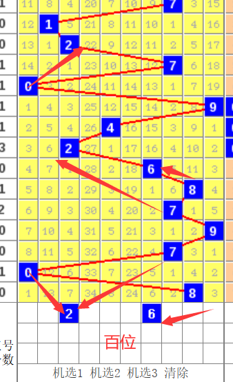 现在我们看一下百位,百位上期开了一个8,然后本期的话,这个百位很明显是要往左进行运动,那么往左的话,有一个6是一个跨度为2的一个6。这个6也是非常好,还有一个是这个2。所以说百位的话情况就比较好选。基本上2.3.6这几个号码