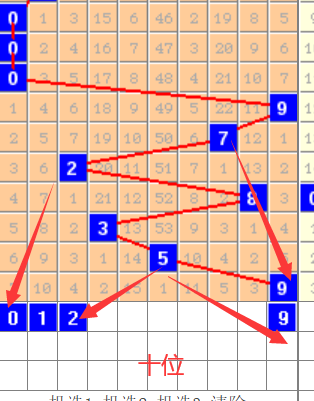 现在我们再看一下十位的情况,十位上一期开了一个9,然后本期的话,十位这个9是有重复的可能的。如果说9不重复的话,就要根据这个5为参照点进行往左的一个旋转,那么就有可能会旋转到012,所以说十位的情况也是比较好看的,十位基本上可以推断为四码0129