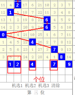 第三步,我们看一下个位的情况。个位上一期开了一个8。那么个位这个9的话是一个。是一个斜连号码,这个号码风险比较大,那么我们首先考虑第一个是7。然后呢,我们考虑间隔两期这个4,如果是远跨的话,我们还要考虑1.2,所以说个位的情况啊,大概可以推断4个号码1247
