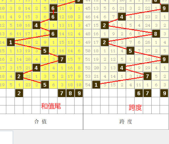 最后我们再看一下这个和值尾数,还有跨度这个走势图,和值尾呢,我给出了几个尾数,一个是和值2尾,和值7尾,和值8尾,和值9尾,跨度呢,我给了两个两个看法,一个是6跨,一个是9跨,当然这个隔期7号也有可能,这个跨度呢,应该是一个大跨度