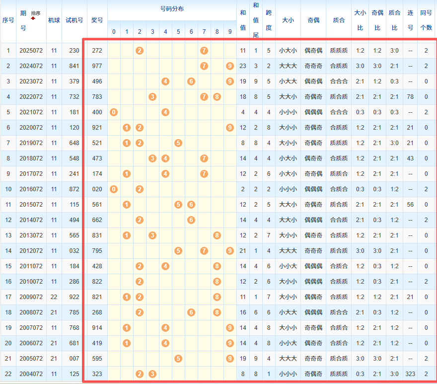 1、统计往年同期开奖号码