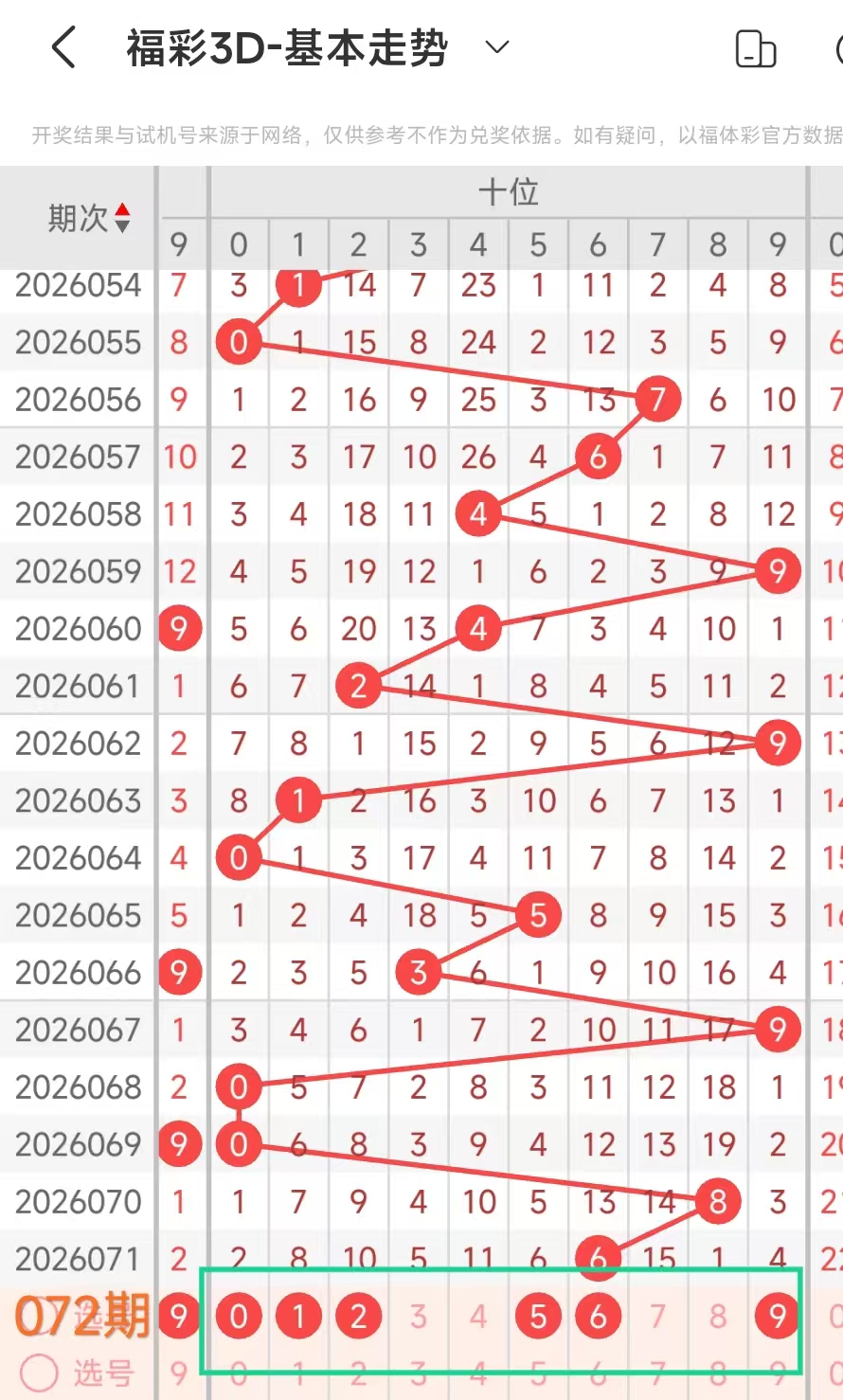 3、当个位开出1后下期开出:15165939416,经统计0号出0次、1号出现3次、2号出现0次、3号出现1次、4号出现1次、5号出现2次、6号出现2次、7号出现0次、8号出现0次、9号出现2次。观察发现1569号没出现,本期可以考虑。