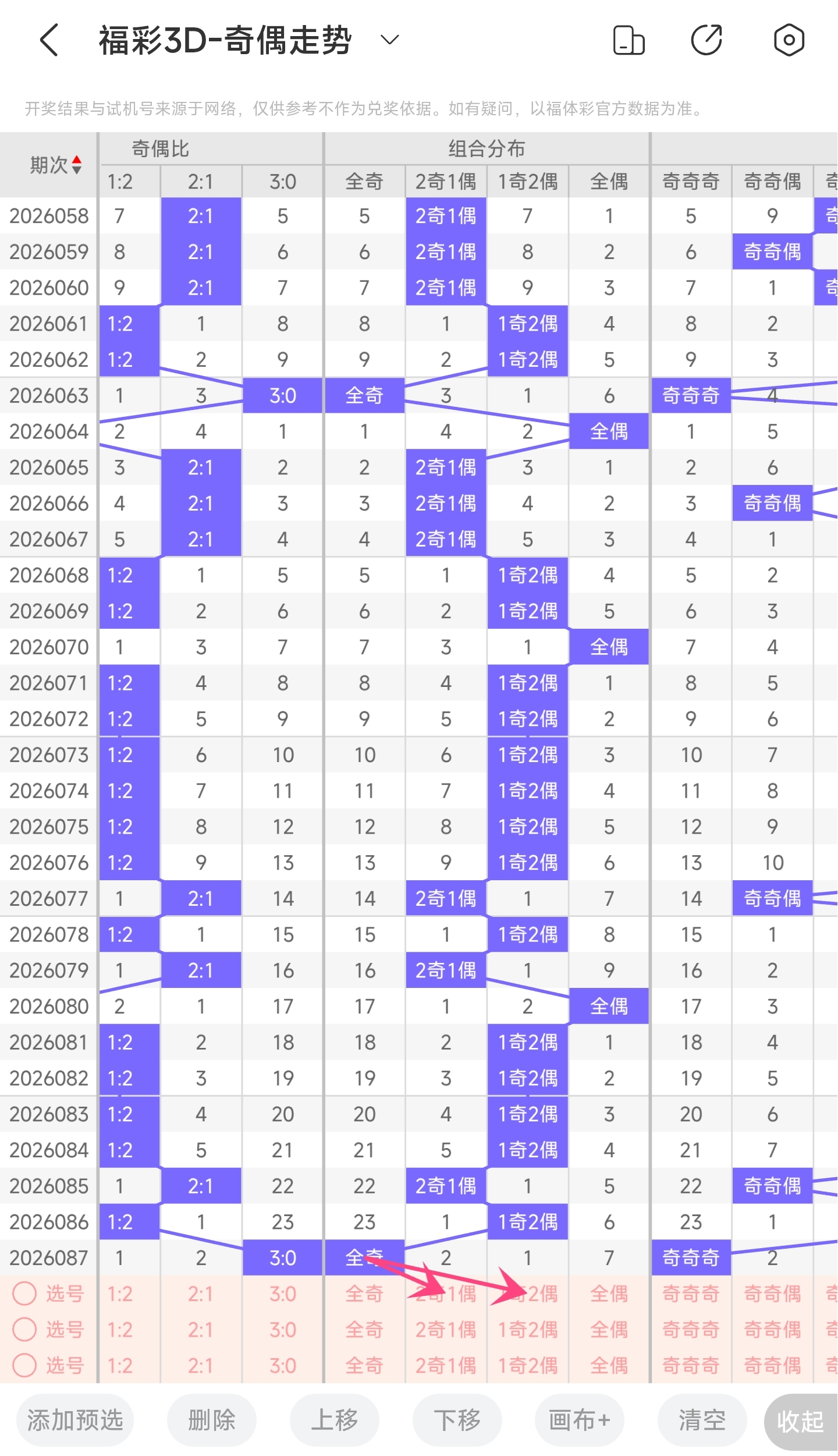 上期开了全奇的情况,往前一期开出的是12偶。从组合数学理论上来讲,开出21偶和12偶的概率都为37.5%,开出全偶和全奇的概率为12.5%。通过分析目前30期内的数据。本期的开出全偶的概率是10%,开出全奇的概率为6.66%,开出12偶的概率为53.33%,开出21偶的概率是30%。和前一期相比,全偶概率变小,全奇概率变大。通过走势图分析,上期开了全奇,推测本期可能会开21偶,其次是12偶,然后是全奇或者全偶类型。