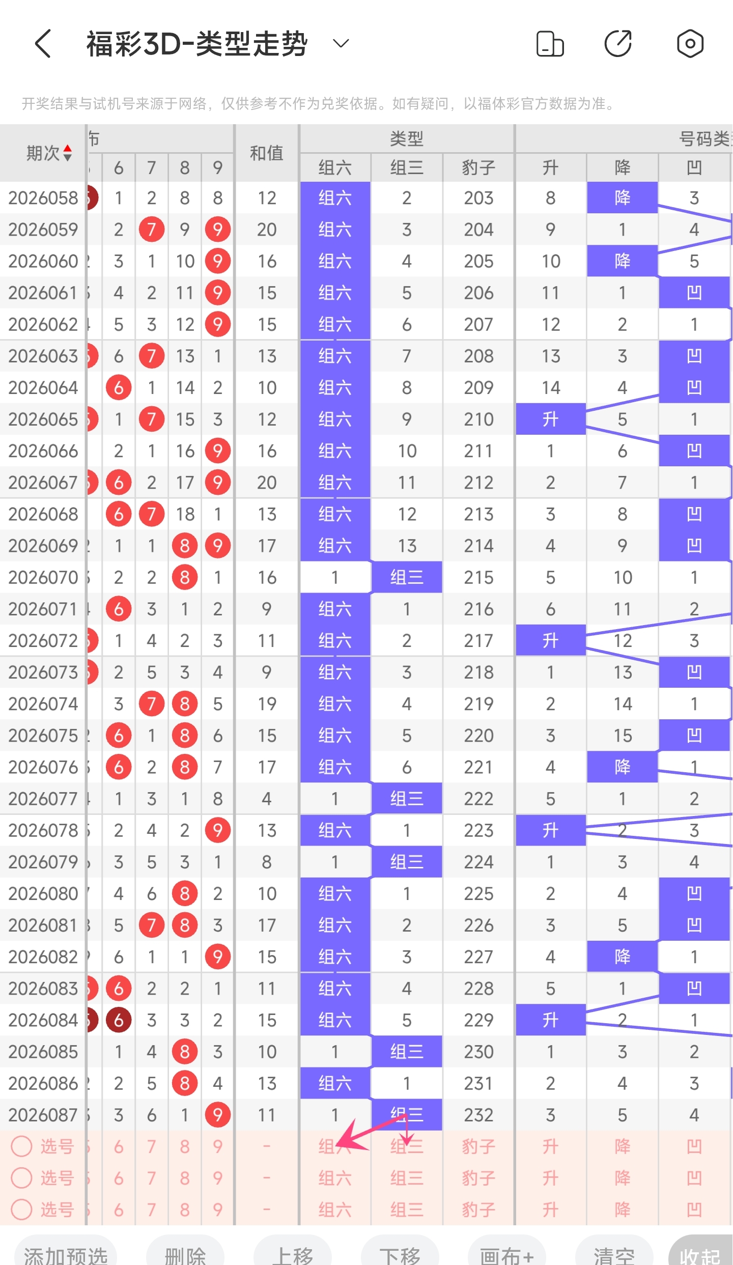 上期开出了组六类型,往前一期是组三类型。理论上开出组六的概率是72%,开出组三的概率是27%,开出豹子的概率是1%。通过分析目前30期内已经开出的概率,组六概率为83.33%,开出组三概率是16.66%。开出豹子的概率为0%。与前一期相比,组三概率变大,组六概率变小。通过走势图可以看到上期开了组三,推测本期可能开组六。所以推测本期大概率开组六,防开组三。