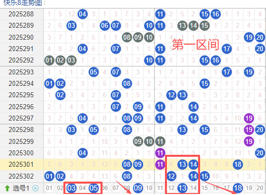 上期一区开6奖号(01.02.08.12.14.15)上期回顾一区开6个奖号一区间的奖号在上期呈现了不变趋势,1字头回补了3个,本期先来看号码05具有一定的间歇性,近期比如有时会间隔 4到6期次出现,整体出现频率不是很稳定,号码09活跃度近期较温热。有一定的间歇性,间隔上来说的话也不是很稳定,整体走势有一定的波动性,有明显的冷热趋势变化,出现的频次近期比较温热.号码13活跃度相对是很稳定,没有明显的连续出现,偶尔间隔多期会出现一次整体表现较热