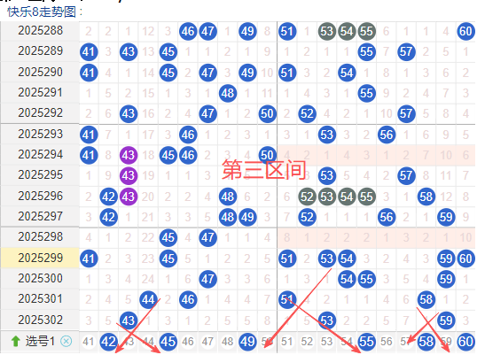 三区间开出了3个奖号(43.53.59.)上期回顾三区开出3个奖号上期的三区间的奖号数量呈现一个递减的形态,4头回补1个号码,5头回补2个,本期先来看号码42近期出现频率相对来说不是很稳定的一个号码。说明其在近期的开奖中较温冷,号码45在近30 期内出现次数还是很稳定,间隔上来说也还是很稳定。号码49近期比较热的一个号码,通常间隔3-4期会出现一次,没有明显的连续出现态势,走势相对较热,在整个第三区间的表现可以防守的。号码55近期走势相对近期比较热,近期没有连续间隔落号的情况,活跃度近期处于热态注意防守。