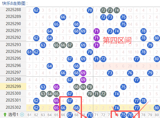 上期四区间开出了7奖号(60.62.66.68.74.77.80)上期的四区开5个奖号呈现了一个递增的趋势,6头开出的奖号4个,7头回补2个,先来看号码67在近 30 期内属于一个还是很稳定号码但是本期是一个联动的落位码这个号码要注意防守,号码63有一定的间歇性活跃度稳定比如有时会间隔 6到5期就再次出现,近期整体出现频率比较热,近期还是要关注的.号码70活跃度近期也是很稳定注意参考的是一个热号这里可以参考。号码76号近期的热度较冷是一个三斜连的落位注意参考。