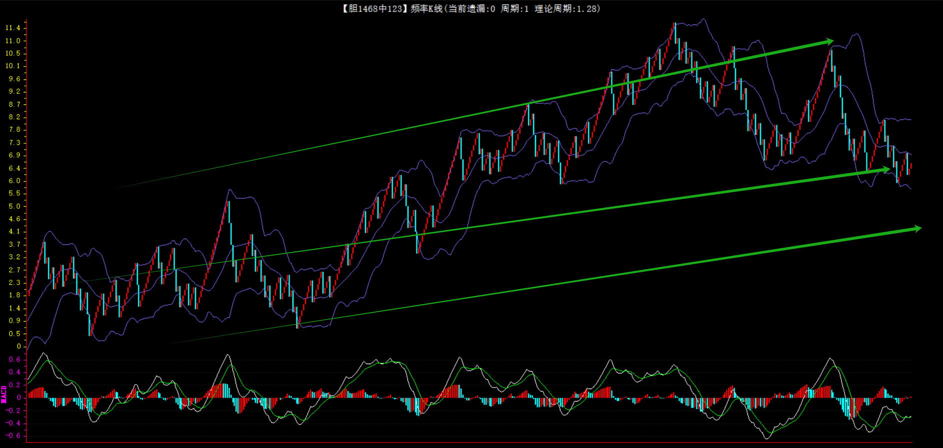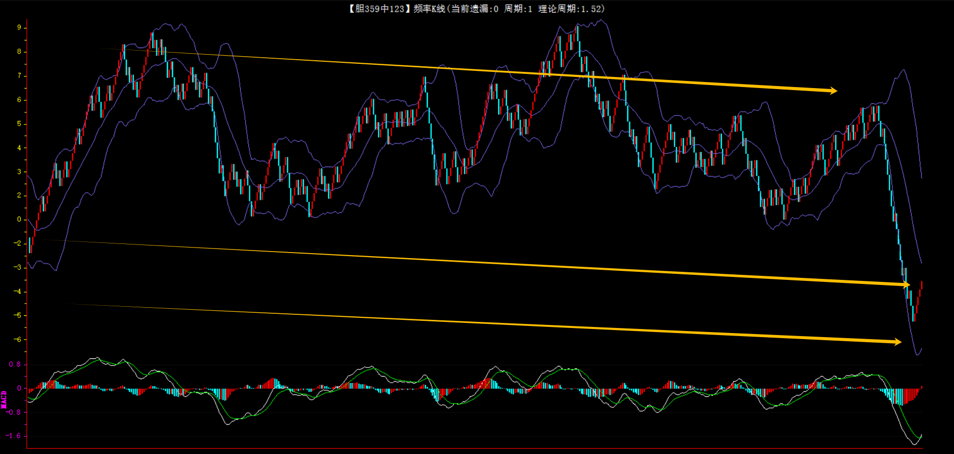整体趋势下行,上边沿线趋势向下,下边沿趋势也是向下,节点震荡,当前连开5期,本期防守。