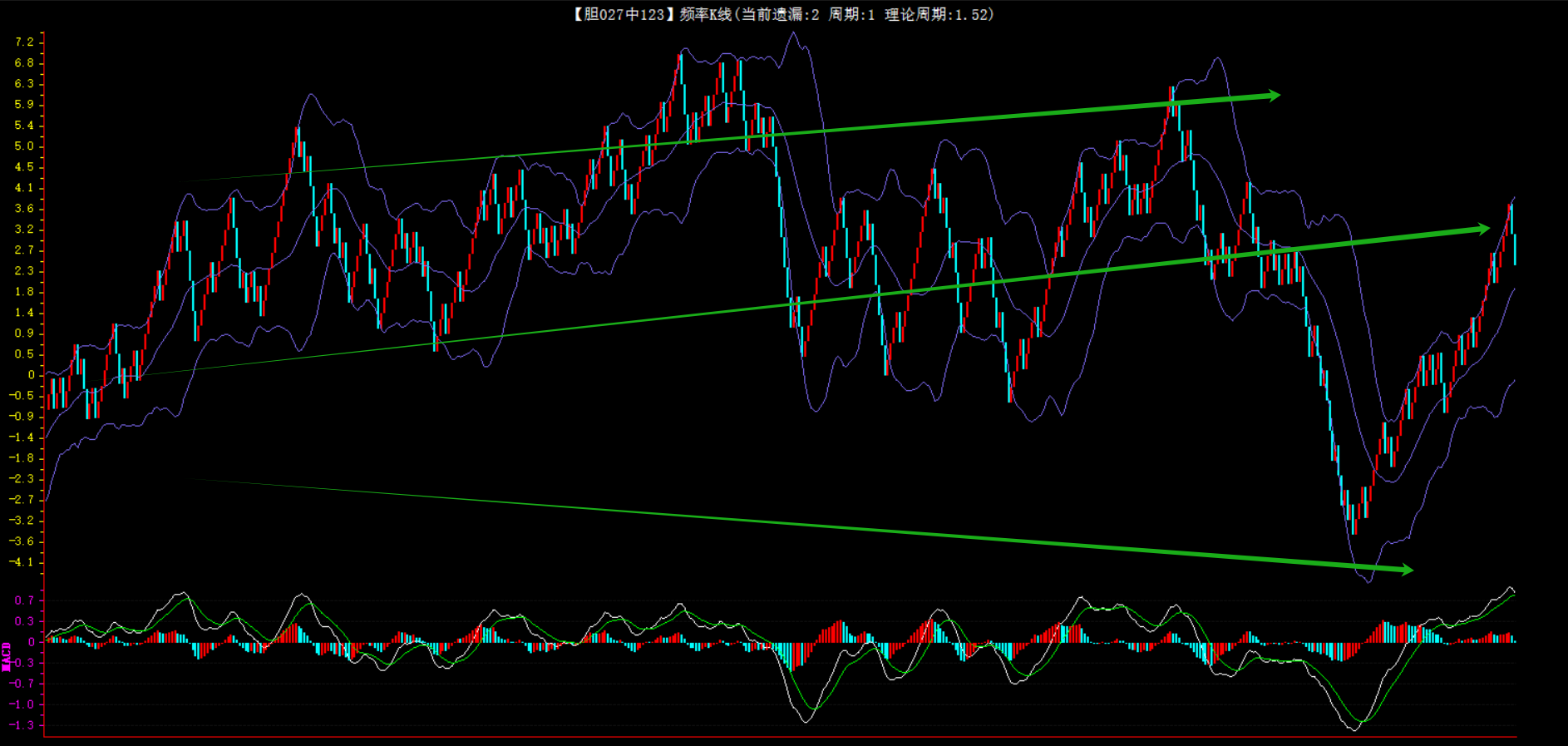 整体趋势上行,上边沿线趋势向上,下边沿趋势向下,节点震荡,当前遗漏2期,本期关注。