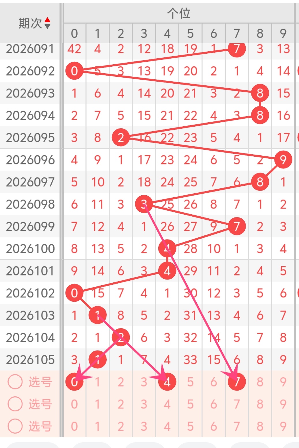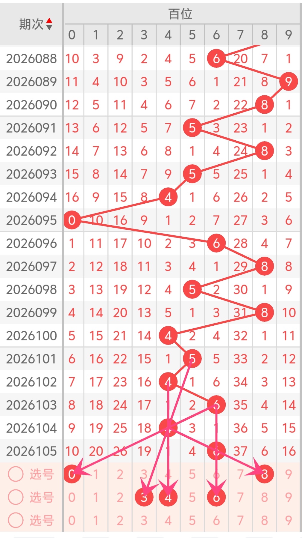 近期百位号码整体呈现中大数震荡走势,近10期开出号码集中在3-9区间,小号0、1、2开出频次明显偏少,处于冷号回补阶段。从奇偶形态来看,近期奇数百位连续走热,偶数号码出现断层,按照号码冷热平衡原理,今日百位可以优先关注偶数回补,重点参考数字2、4、6;从大小走势区分,大数持续开出后,本期百位防小号突围,综合冷热搭配,百位主推2、6,防守4、9。再结合走势图延伸法。